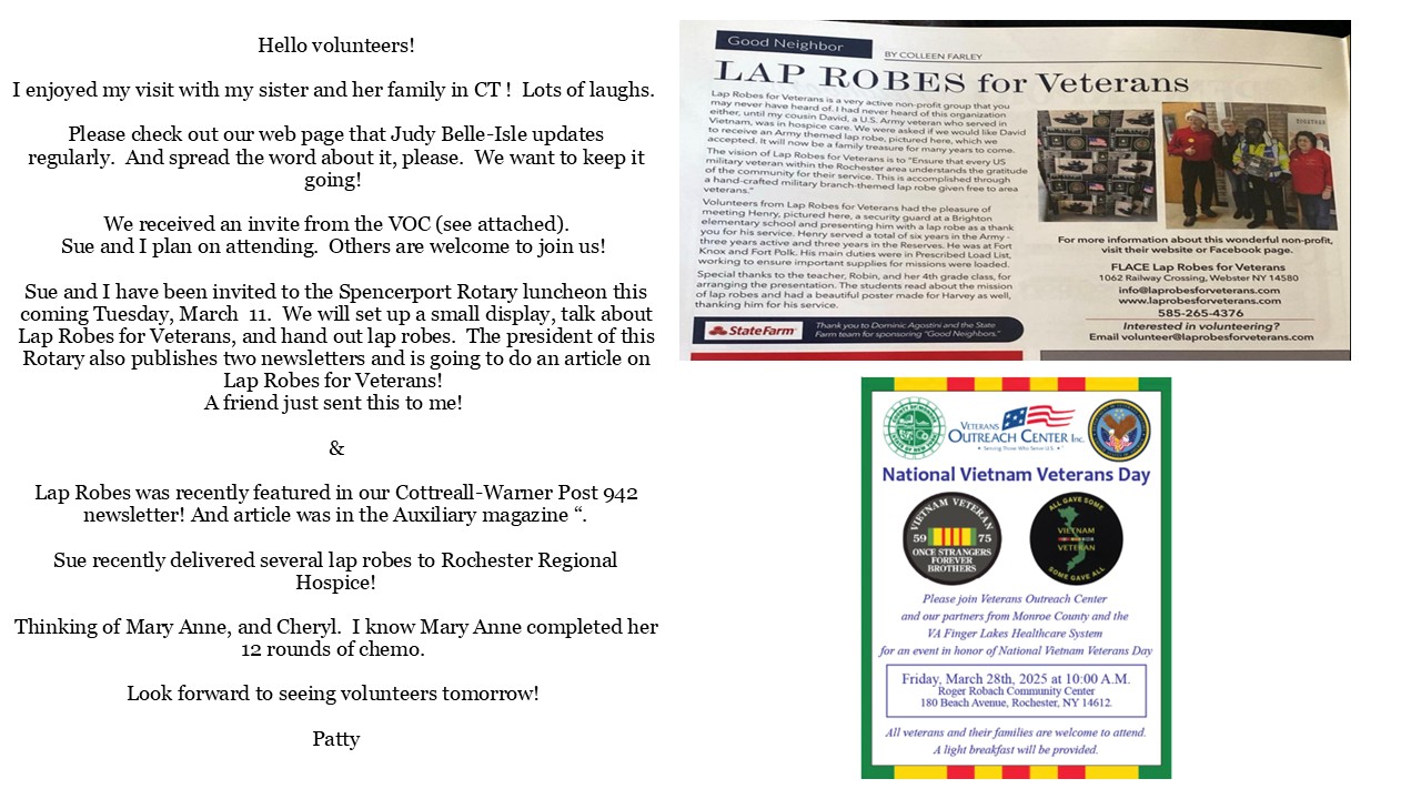 Volunteers continue mission to make comforting lap robes for Veterans 6/2021 New York Unit 942 members volunteer with Lap Robes for Veterans 1/16/2025 “Always Veterans Day” thanks to Lap Robes for Veterans 8/2020 Click the article box to see the article March 9th, 2025
